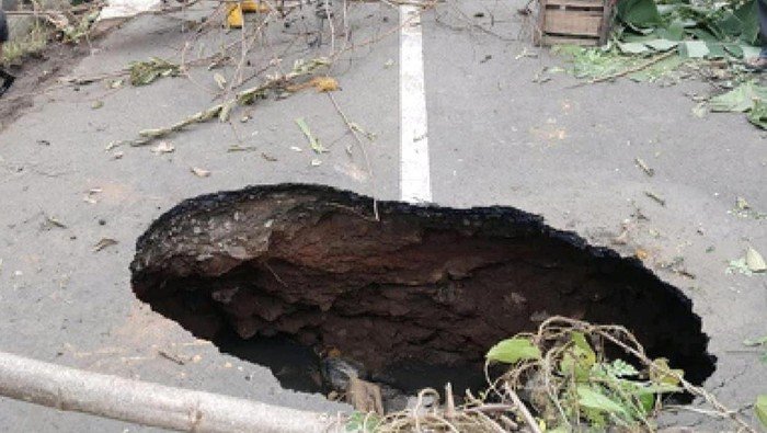 Lubang tanah amblas atau sinkhole muncul di Desa Karangkamulyan, Kecamatan Ciawigebang, Kabupaten Kuningan , Jawa Barat. Sinkhole menyebabkan jalan raya kabupaten penghubung Ciawigebang-Cihaur ikut amblas dan mengganggu arus lalu lintas.