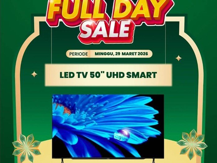Transmart Full Day Sale hadir lagi pada Minggu 29 Maret 2026. Mulai toko buka hingga pukul 22.00 WIB, pelanggan bisa menikmati diskon besar-besaran untuk berbagai produk elektronik pilihan, salah satunya LED TV 50 inch UHD Smart